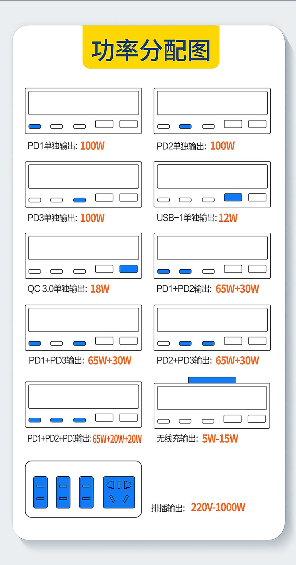 Simultaneous use C1+C2+C3+QC3.0 : 60W+20W+20W+20W